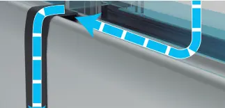 Sans profilés verticaux, cette fermeture en verre panoramique dégage la vue jusqu’à 98 %. Avec un verre trempé de 10 mm soutenu par deux profilés en aluminium, le système offre un environnement confortable toute l’année : un gain de 10°C avec l’extérieur et une réduction sonore de 23 dB.