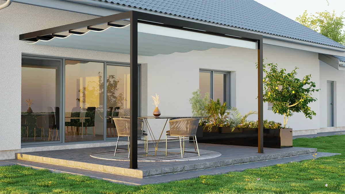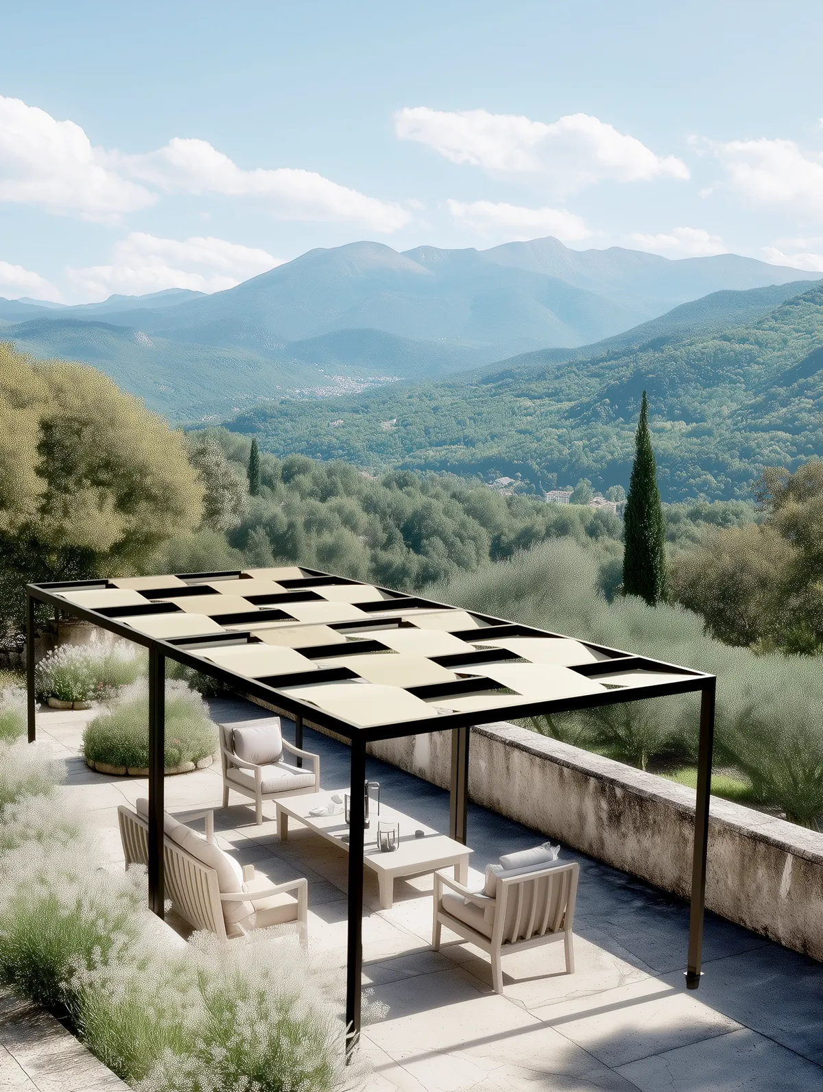 Disponible en 4 modèles, elle peut accueillir des bandes tissées entrelacées pour un rendu aérien, une toile rétractable pour moduler l’ombre et la lumière au fil de la journée, ou encore des lames en aluminium qui allient élégance et modernité. Une seule structure, plusieurs ambiances, pour une pergola à la fois fonctionnelle et résolument décorative.
