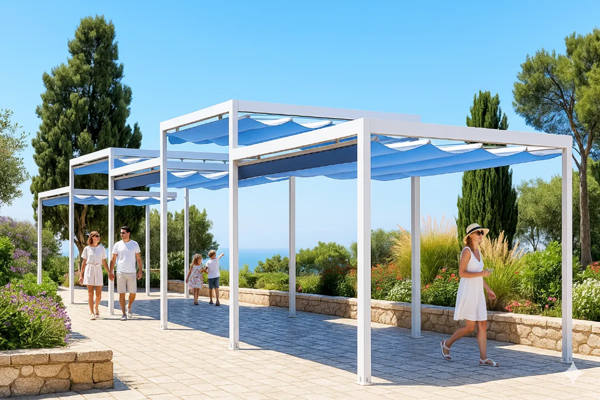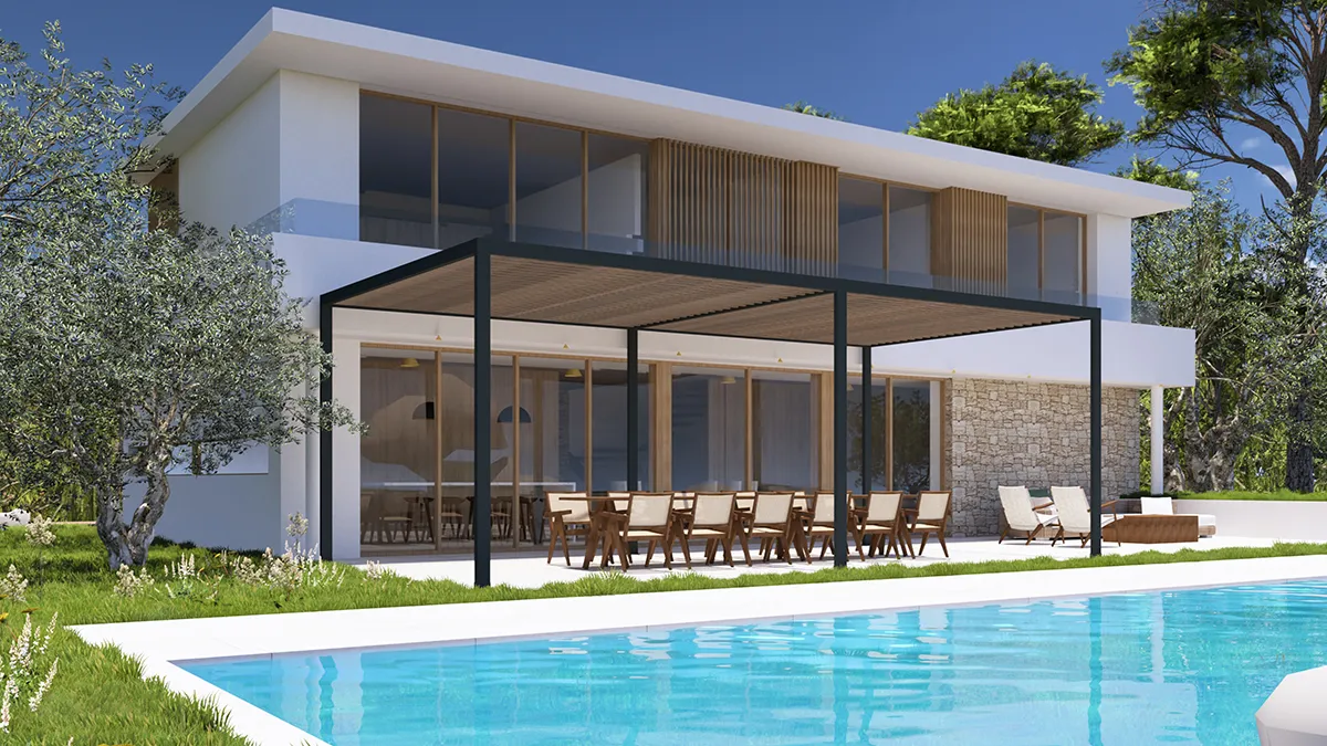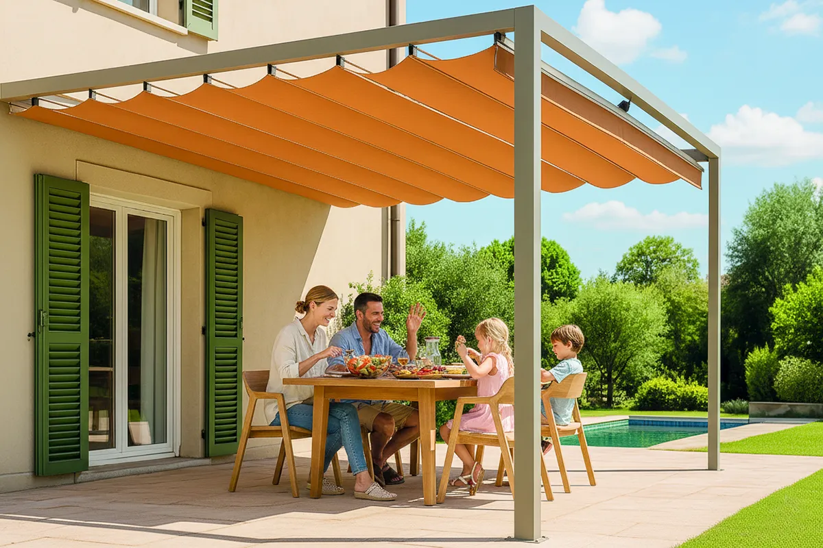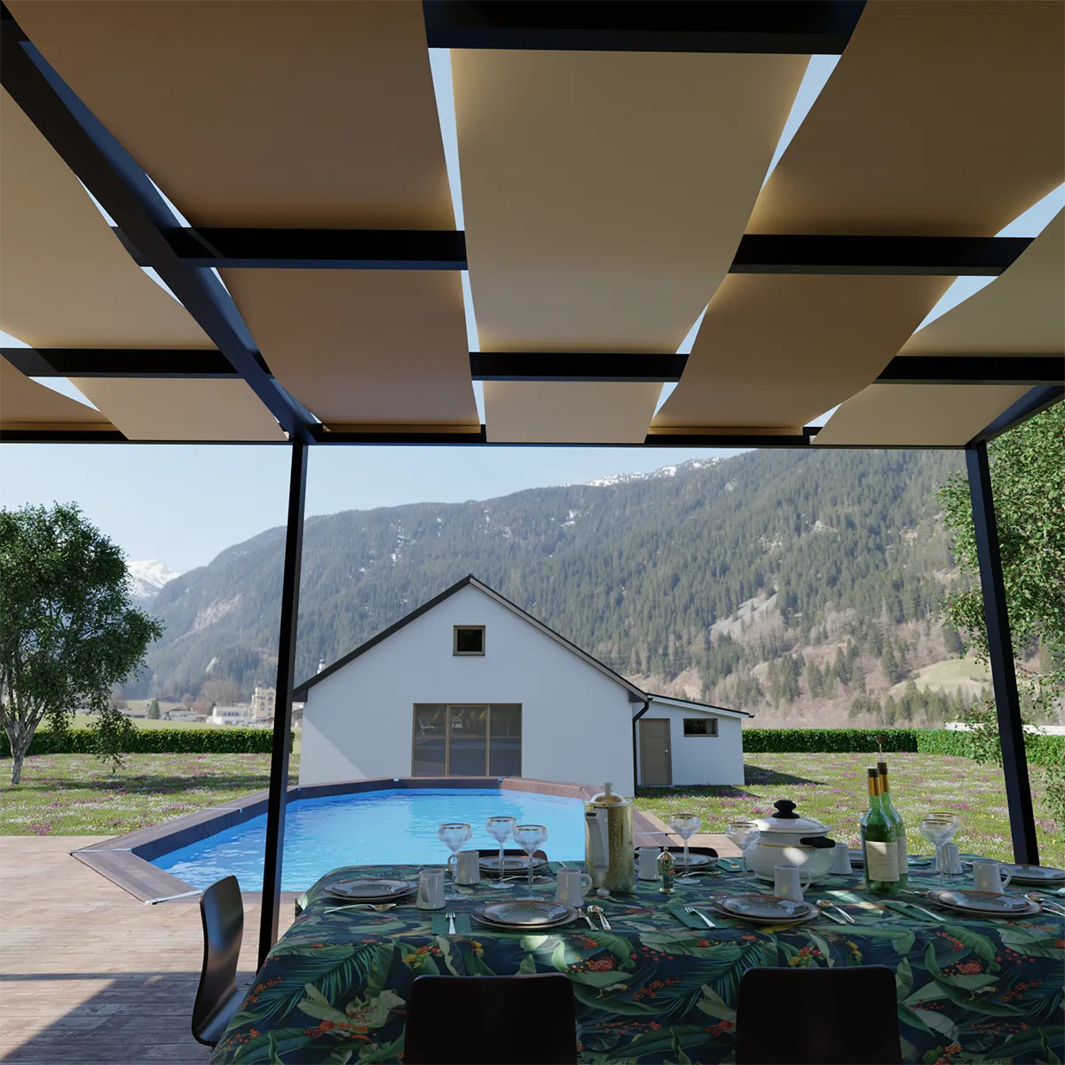 Disponible en 4 modèles, elle peut accueillir des bandes tissées entrelacées pour un rendu aérien, une toile rétractable pour moduler l’ombre et la lumière au fil de la journée, ou encore des lames en aluminium qui allient élégance et modernité. Une seule structure, plusieurs ambiances, pour une pergola à la fois fonctionnelle et résolument décorative.