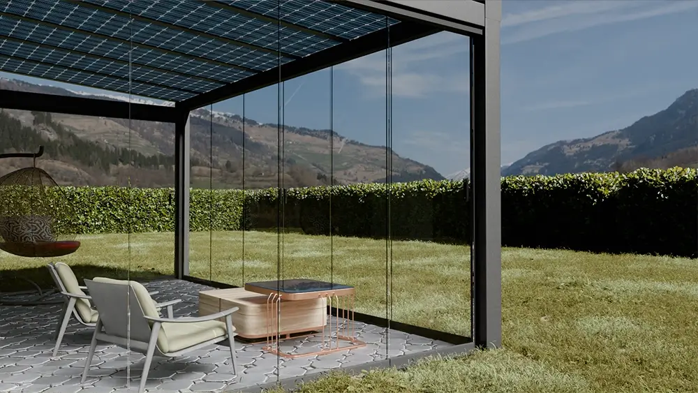 Protégez-vous du soleil tout en produisant de l'énergieLa Pergola à Toiture Photovoltaïque Glass Systems est une structure conçue pour capter et transformer l'énergie solaire en électricité. Elle est équipée de panneaux solaires intégrés à son toit, qui absorbent la lumière du soleil et la convertissent en énergie électrique via ses cellules photovoltaïques. Cette énergie peut être utilisée pour alimenter les appareils électriques de votre domicile ou de votre entreprise.